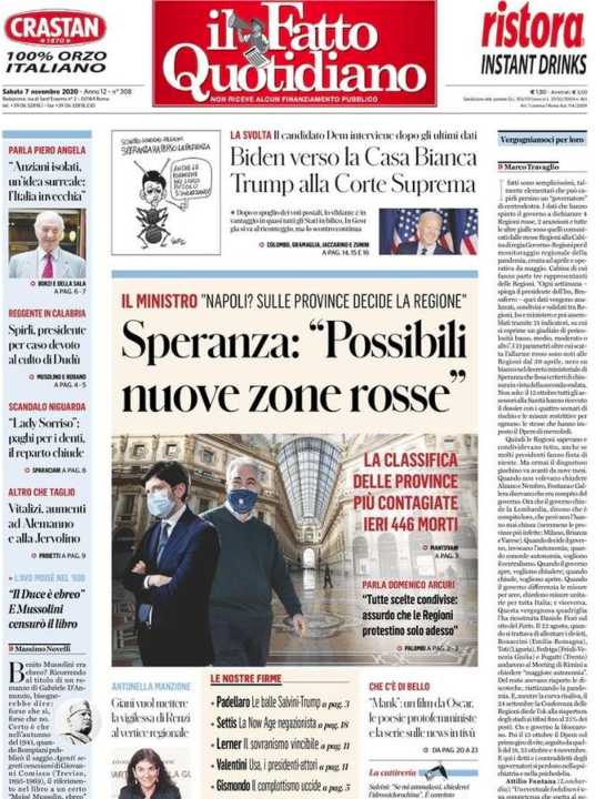 Il Fatto Quotidiano apre con le parole del Ministro Speranza sull’eventualità di nuove zone rosse.