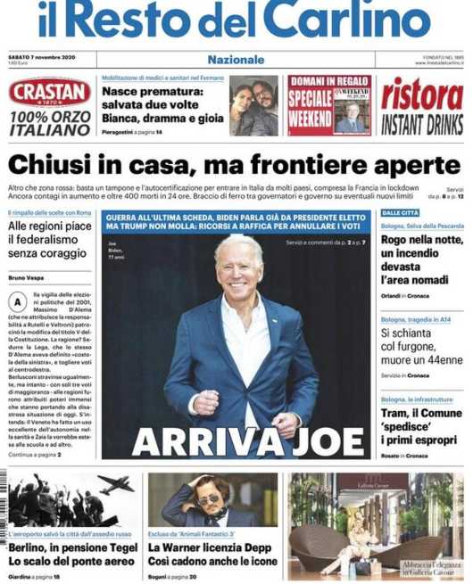 Il Resto del Carlino apre con la probabile vittoria di Joe Biden alle presidenziali americane.