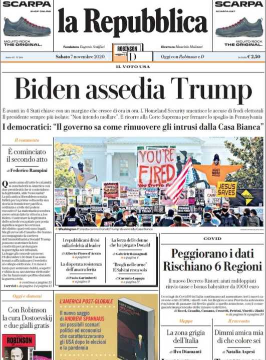 La Repubblica sottolinea la vittoria di Joe Biden alle elezioni presidenziali americane. Si parla anche degli scontri che stanno accadendo in alcune zone del paese.