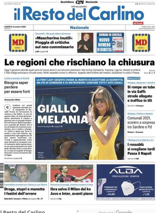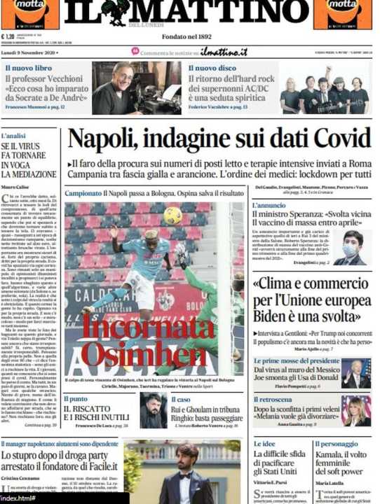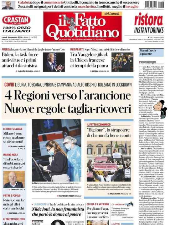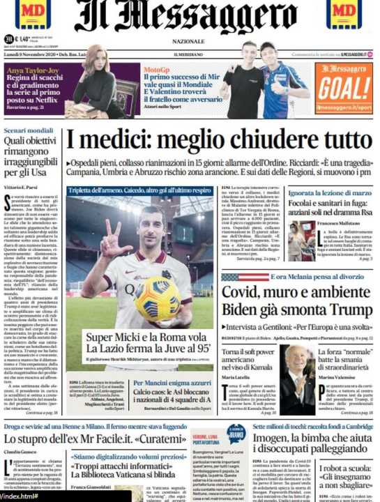 Di seguito la rassegna stampa dei principali quotidiani italiani di oggi, 9 novembre 2020.