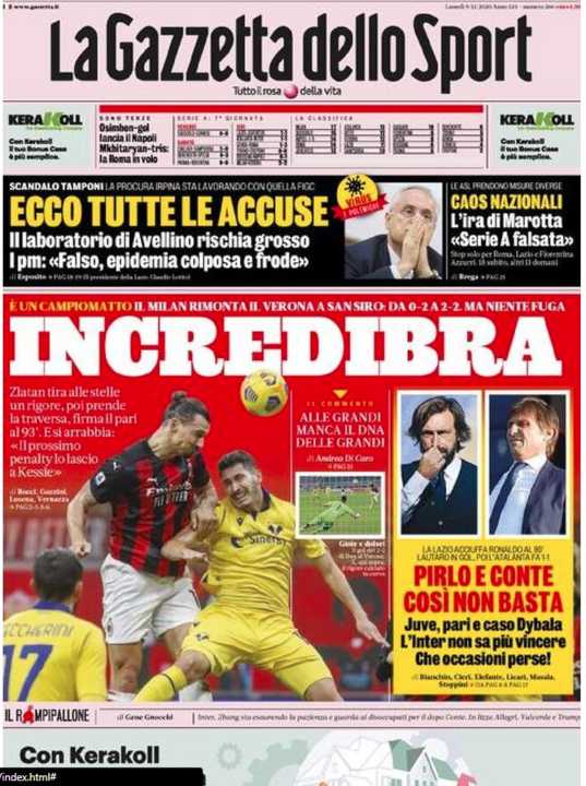 La Gazzetta dello Sport apre con l’ennesima impresa di Zlatan Ibrahimovic. Lo svedese, a 39 anni, prima ha sbagliato un rigore e poi ha salvato il suo Milan.