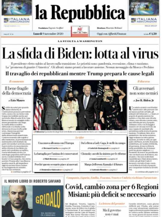 La prima pagina de La Repubblica si concentra totalmente su Joe Biden. C’è un’analisi del suo programma contro il Covid e delle idee che metterà in campo nei prossimi mesi.