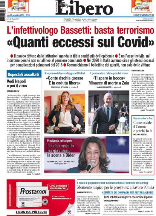 Libero apre con un’intervista al noto virologo Bassetti, che sottolinea tutte le esagerazioni legate al Covid.