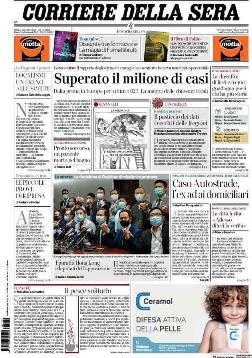 Il Corriere della Sera apre con il numero di contagi in aumento, superato il milione.