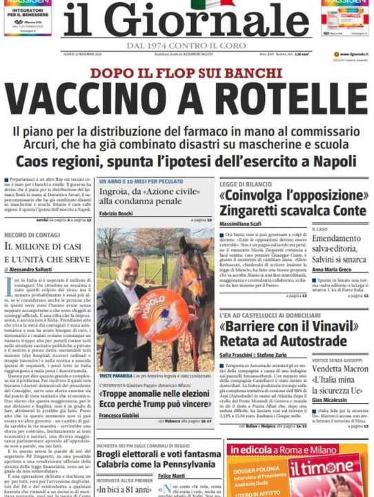 Il Giornale apre con una forte critica al commissario Arcuri, già criticato per la gestione delle mascherine.