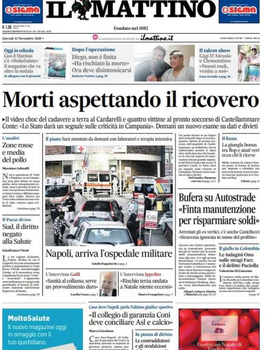 La prima pagina de Il Mattino si sofferma sulla persona morta al Cardarelli in attesa di ricovero per sospetto Covid.
