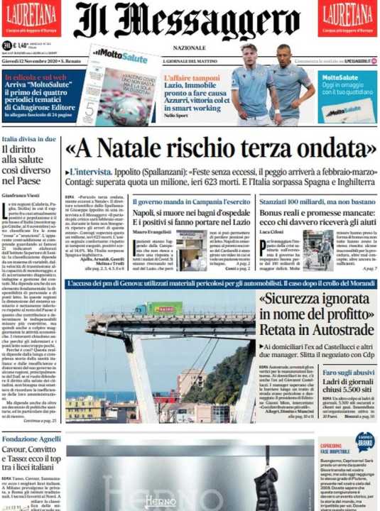 Il Messaggero apre con il rischio di una terza ondata a Natale.