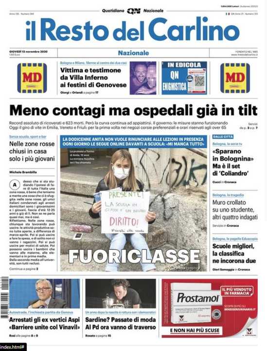 Il Resto del Carlino apre con la situazione critica negli ospedali italiani, nonostante un calo dei contagi.