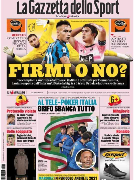 La Gazzetta dello Sport si sofferta sui rinnovi contrattuali di Dybala, Lautaro Martinez e Donnarumma.