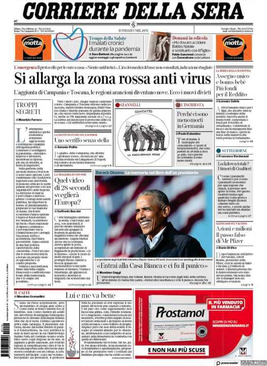 Il Corriere della Sera apre con l’aggiunta di Campania e Toscana all’elenco delle regioni rosse.