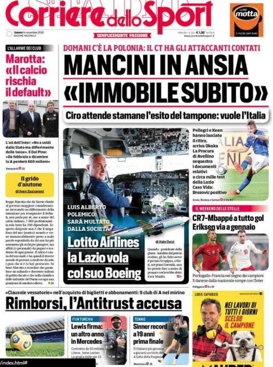 Il Corriere dello Sport apre con le parole del ct Mancini, che vorrebbe Immobile disponibile in Nazionale per i prossimi impegni.