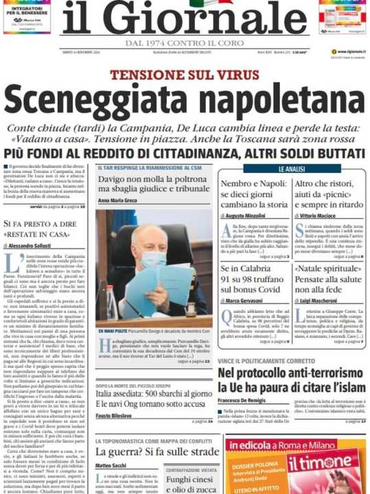 Il Giornale definisce una “sceneggiata napoletana” l’inserimento della Campania in zona rossa, con chiaro riferimento al comportamento di De Luca.
