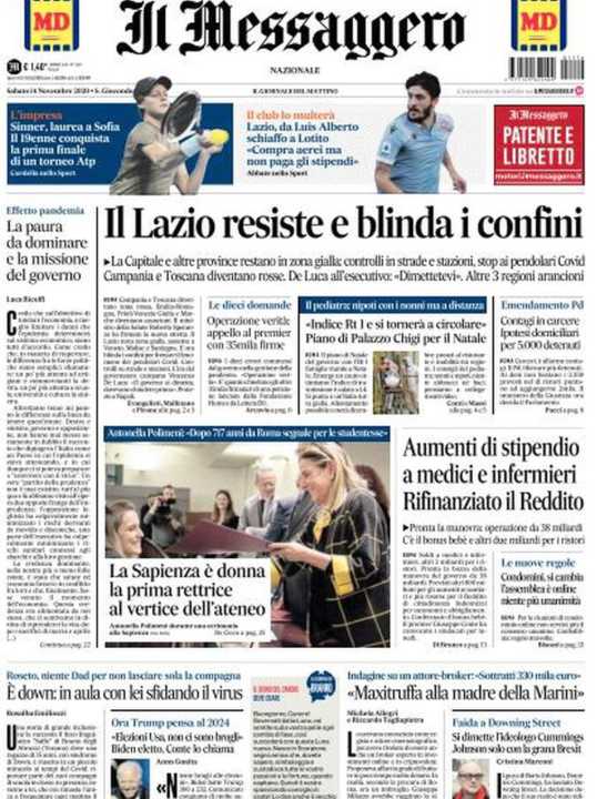 Il Messaggero apre con la permanenza del Lazio nella zona gialla e della chiusura dei confini della regione.