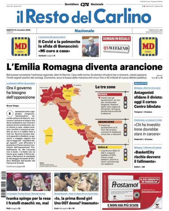 Il Resto del Carlino apre con l’inserimento dell’Emilia Romagna in fascia arancione.