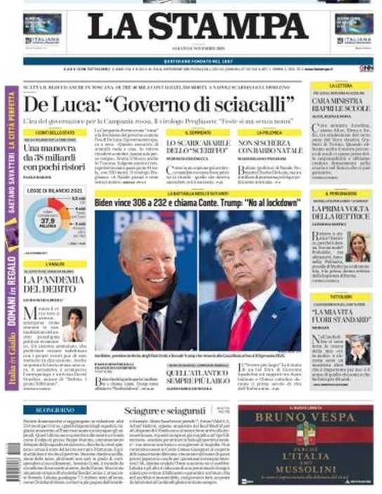 La Stampa apre con le forti critiche di De Luca al Governo. La Campania sarà zona rossa da domenica.