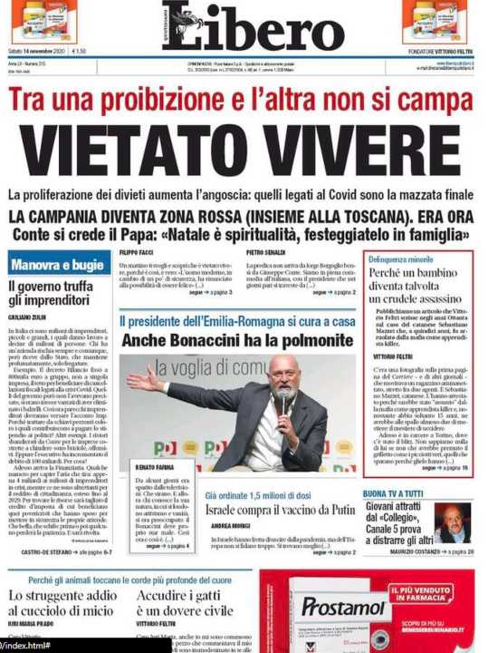 Libero apre con un “Vietato vivere”, che sottolinea le rinunce alle quali il popolo italiano è stato sottoposto.