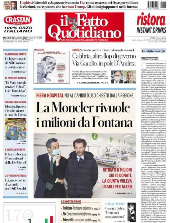 La prima pagina de Il Fatto Quotidiano si concentra su Fontana, Presidente della Regione Lombardia.