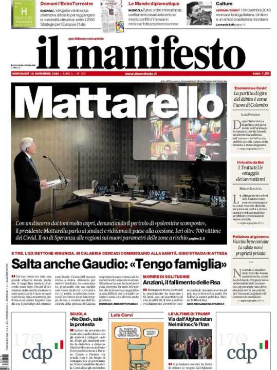 Il Manifesto apre con il discorso di Mattarella, che ha chiesto ai cittadini italiani di essere prudenti e responsabili.