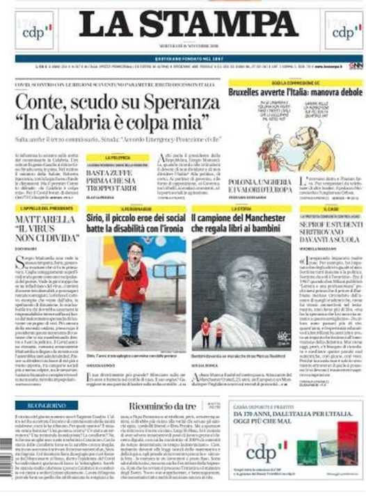 La prima pagina de La Stampa mette in primo piano la difesa di Conte nei confronti del Ministro Speranza.