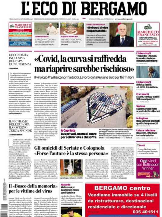L’Eco di Bergamo apre con le parole del virologo Pregliasco. Secondo il virologo la curva pandemica si sarebbe raffreddata ma sarebbe ancora troppo presto per riaprire tutto.