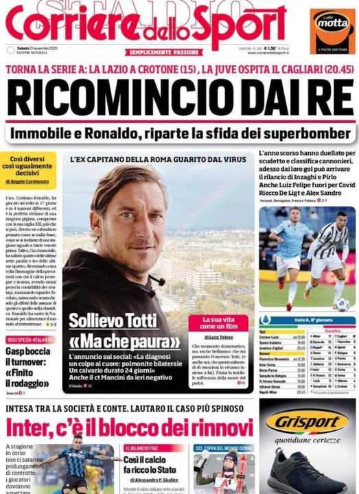 Il Corriere dello Sport apre con le parole di sollievo di Francesco Totti. L’ex capitano della Roma è guarito dal Covid.