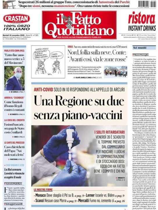 In Edicola sul Fatto Quotidiano del 24 Novembre: Una Regione su due senza piano-vaccini. Anti-Covid https://t.co/wr5lj4Bh4u