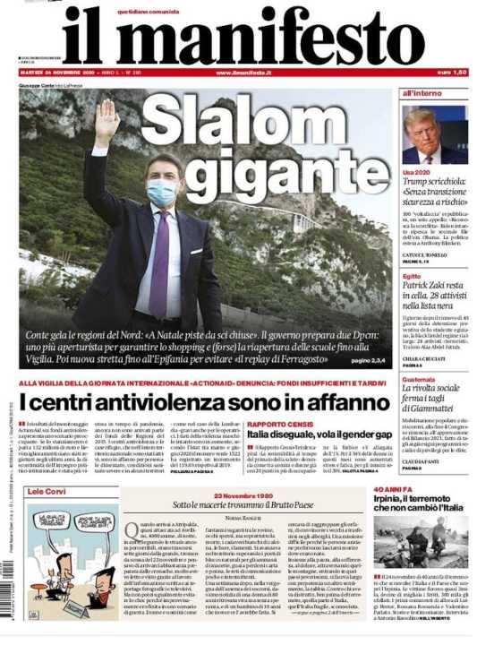 La prima pagina de Il Manifesto si sofferma sulla volontà di Conte di tenere chiuse le località di montagna a Natale.