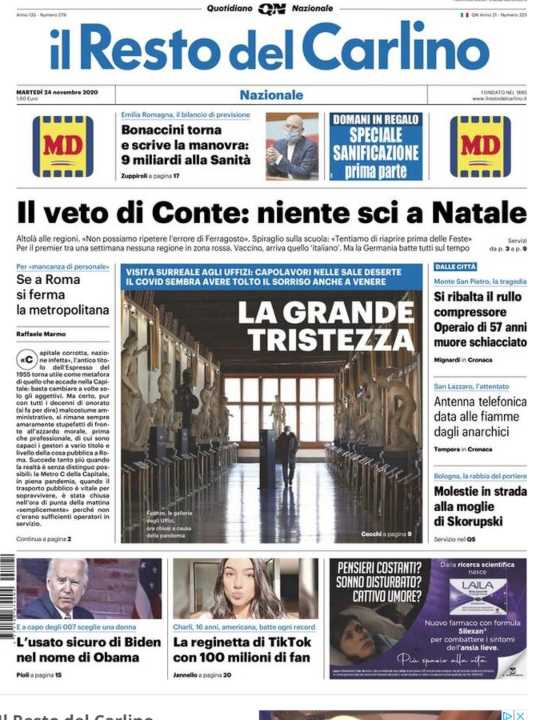 Il Resto del Carlino si concentra sul veto di Conte: “Niente sci a Natale”.