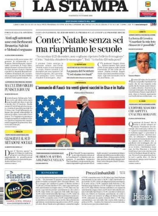La Stampa apre con l’annuncio di Conte di voler riaprire le scuole entro Natale.