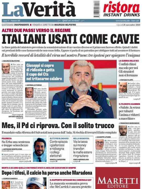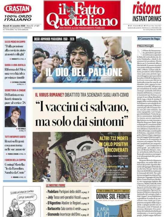 In prima pagina anche la morte di Maradona e articoli di politica e cronaca interna.