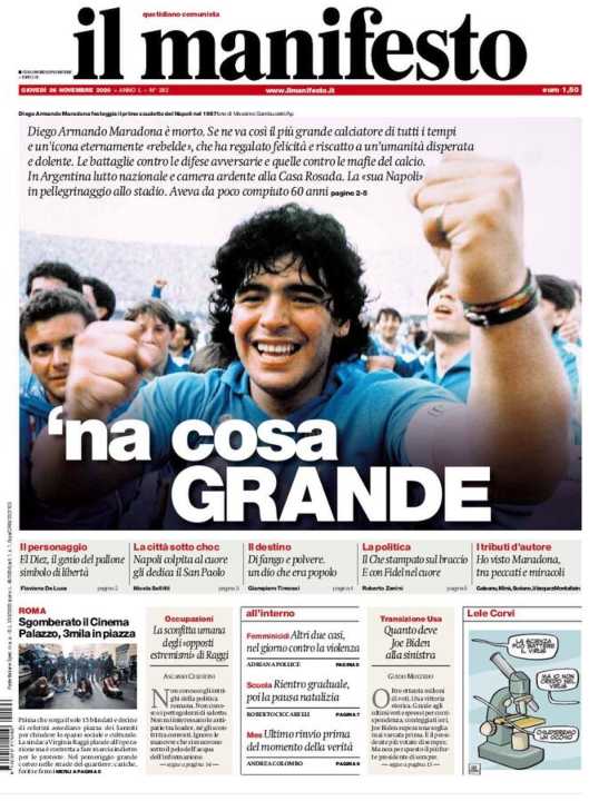 Il Manifesto apre con la morte di Diego Armando Maradona. All’interno un riassunto della sua carriera da calciatore e un approfondimento sulla sua vita.