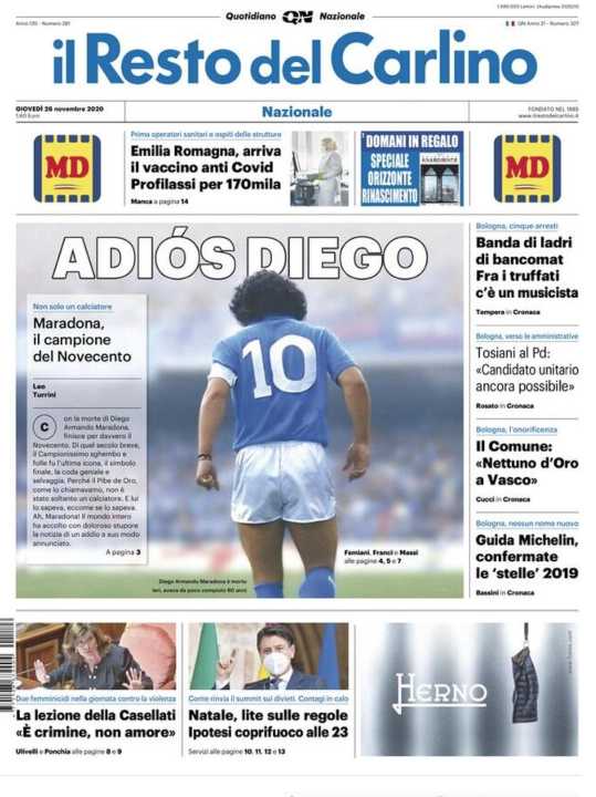 Anche Il Resto del Carlino apre con la morte di Diego Armando Maradona, morto in Argentina a causa di un arresto cardiocircolatorio.