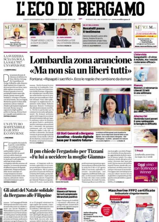 L’Eco di Bergamo apre con la Lombardia che passa da zona rossa a zona arancione.