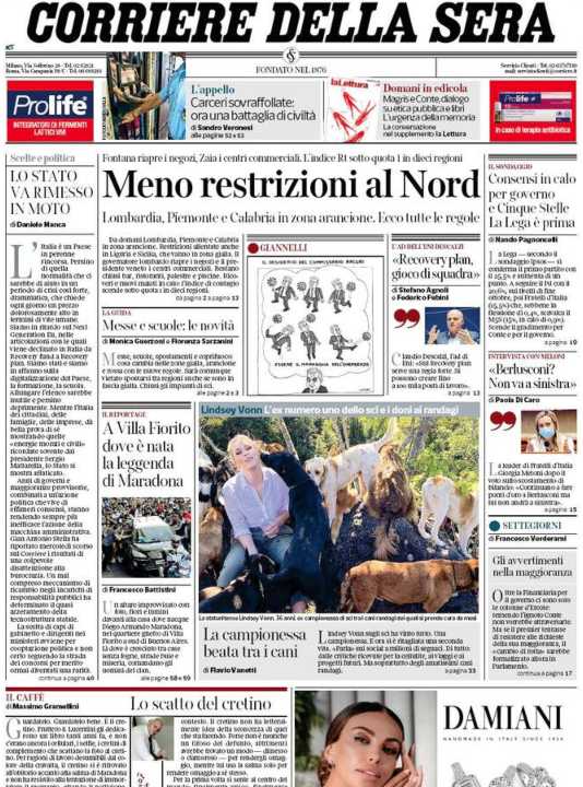 Il Corriere della Sera apre con la riduzione delle restrizioni al nord. In Lombardia riaprono i negozi, in Veneto i centri commerciali.