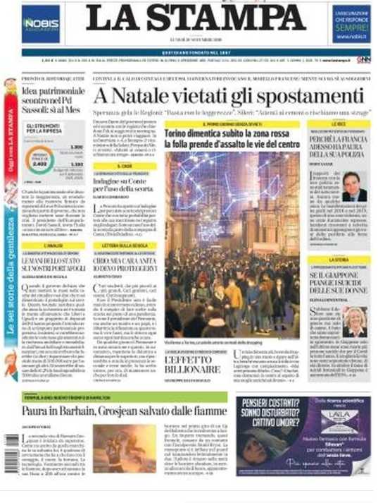 La Stampa apre con le restrizioni che il Governo imporrà a Natale. L’obiettivo è quello di evitare assembramenti.