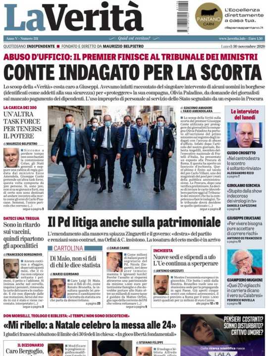 La Verità apre con su una presunta indagine nei confronti di Giuseppe Conte a causa della sua scorta.