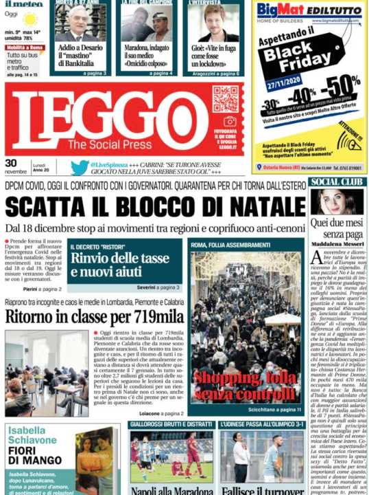 Di seguito la rassegna stampa dei principali quotidiani italiani di oggi, 30 novembre 2020.