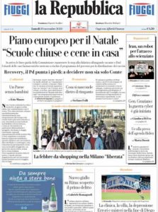 La Repubblica apre con il piano del Governo in vista del Natale: “scuole chiuse e cene in casa”.