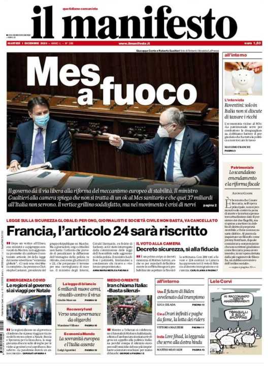 Il Manifesto apre con il dibattito all’interno della maggioranza sul Mes.