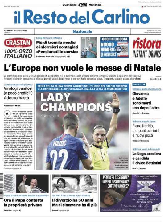 Anche Il Resto del Carlino apre con il veto dell’Unione Europea sulle messe di Natale.