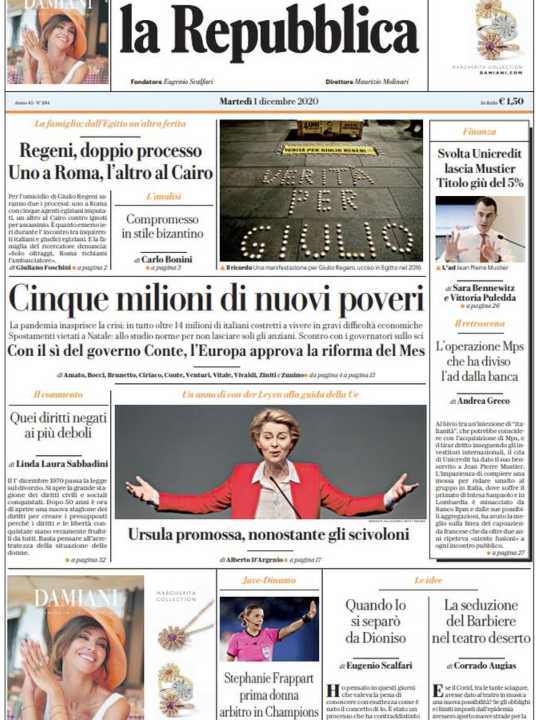 La Repubblica apre con i numeri che sta causando la pandemia. In Italia ci sono 5 milioni di nuovi poveri e almeno 14 milioni di persone vivono in condizioni difficili.