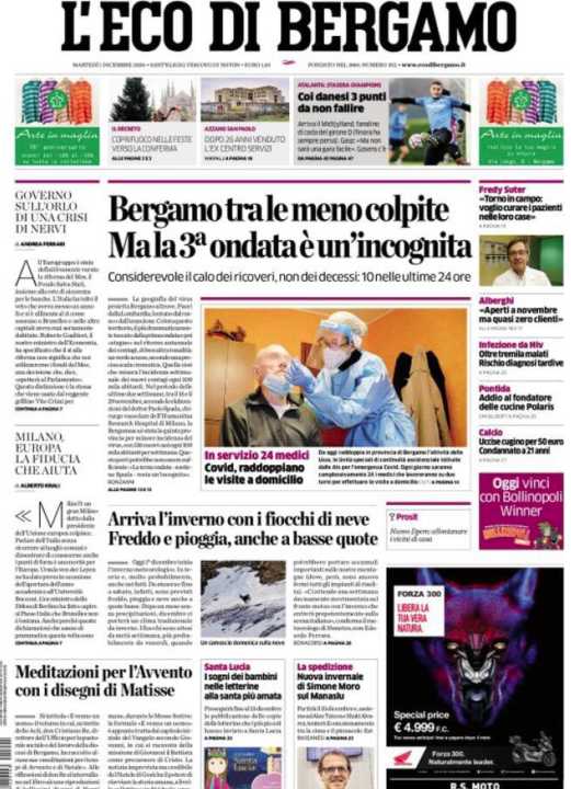 L’Eco di Bergamo apre con una statistica sulle città meno colpite dalla seconda ondata. Bergamo è ai primi posti, ma la terza ondata è ancora un’incognita.