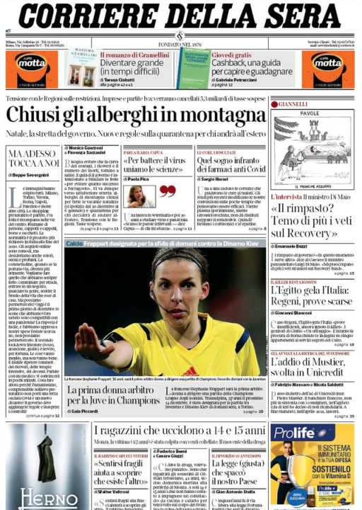 Il Corriere della Sera apre con la chiusura degli alberghi in montagna durante le vacanze natalizie.