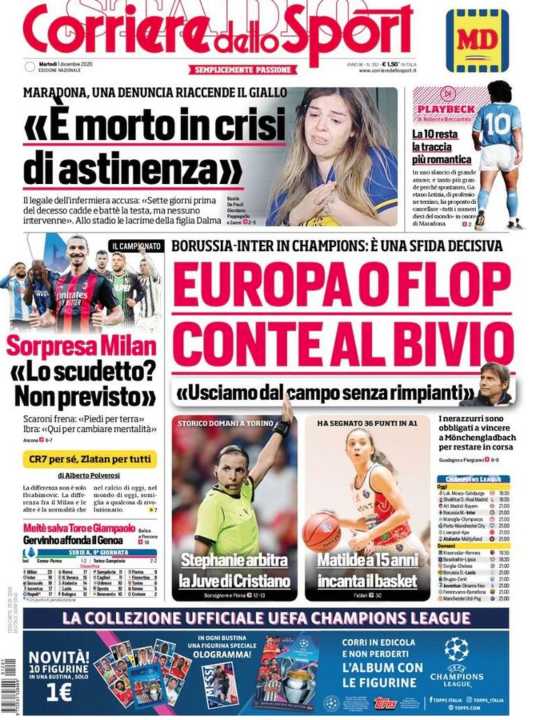 Il Corriere dello Sport apre con la notte decisiva di Champions che affronterà l’Inter. I nerazzurri sono impegnati contro il Borussia Dortmund e non possono più permettersi di perdere.