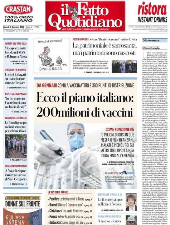 Il Fatto Quotidiano apre con l’arrivo in Italia di 200 milioni di vaccini. La somministrazione inizierà a gennaio.