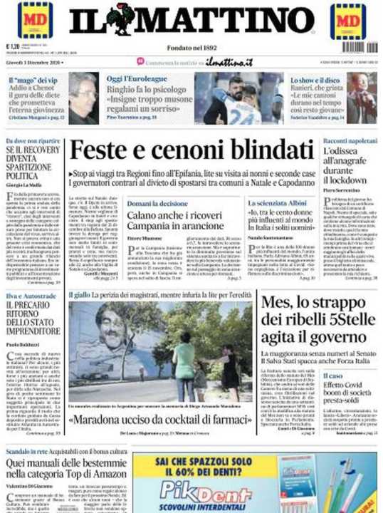 Il Mattino apre con apre con la richiesta dei presidenti regionali di non limitare troppo gli spostamenti durante il periodo natalizio.