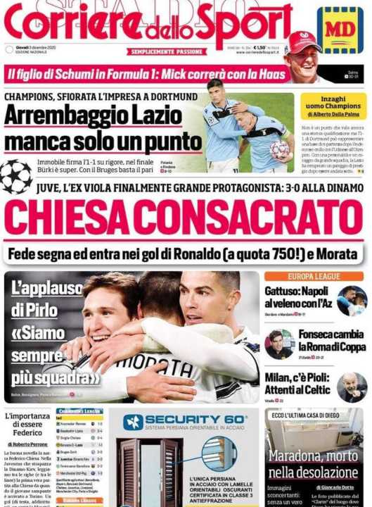 Il Corriere dello Sport apre con l’ottima prestazione di Federico Chiesa nella vittoria per 3-0 della Juventus contro la Dinamo Kiev.