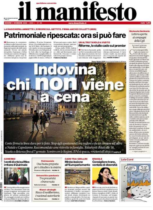 Il Manifesto apre con le restrizioni stabilite dal nuovo Dpcm, che impediranno a molte famiglie di riunirsi a Natale.