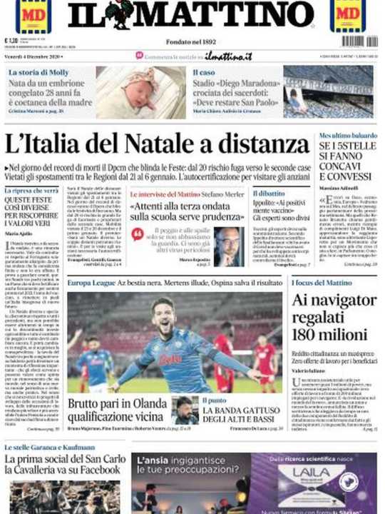 Il Mattino apre con il Natale a distanza che gli italiani si preparano a vivere.