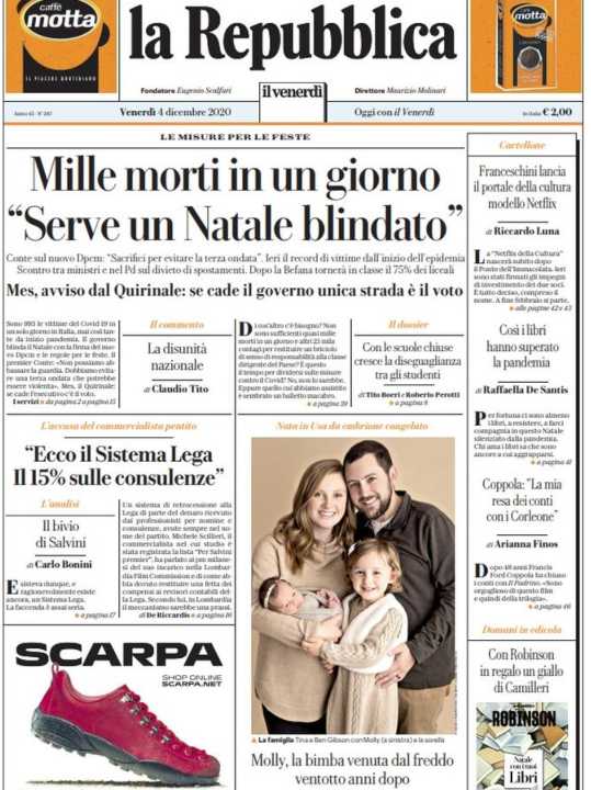 La Repubblica apre con le vittime che il Covid ha fatto ieri in Italia, quasi mille. E’ il record dall’inizio della pandemia.